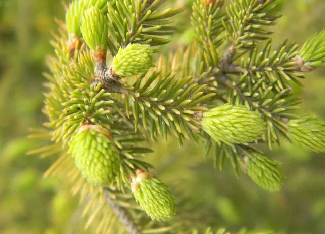 球果卵圆形,熟时苞鳞革质,棕黄色,三角状卵形,先端有坚硬的刺状尖头,边缘有不规则的锯齿,向外反卷或不反卷,背面的中肋两侧有2条稀疏气孔带。