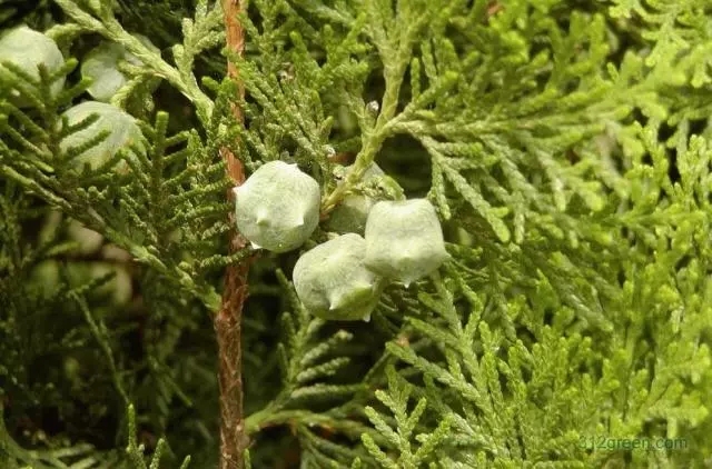 球果近卵圆形,成熟前肉质,蓝绿色,被白粉,成熟后木质,开裂,红褐色。