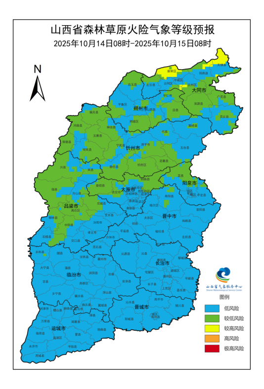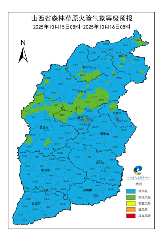 10月15日:大同(云州、天镇、浑源、广灵、灵丘)、朔州(平鲁、山阴、朔城、怀仁、应县)、忻州(河曲、偏关、神池、宁武、繁峙、保德、岢岚、静乐、原平、忻府、定襄、五台、代县)、阳泉(盂县)、太原(娄烦、尖草坪、阳曲、古交、万柏林)、吕梁(临县、兴县、岚县、柳林、石楼、方山、中阳、孝义、交城、交口)为较低风险,火险气象等级较低。大同(阳高、平城、左云、新荣、云冈)、朔州(右玉)、忻州(五寨)、阳泉(平定、郊区、阳泉城区)、太原(小店、清徐、迎泽、杏花岭、晋源)、晋中(祁县、太谷、榆次、平遥、寿阳、昔阳、左权、和顺、灵石、榆社、介休)、吕梁(离石、汾阳、文水)、临汾(永和、隰县、大宁、吉县、襄汾、蒲县、汾西、洪洞、尧都、霍州、古县、安泽、乡宁、曲沃、翼城、浮山、侯马)、长治(武乡、沁县、长子、沁源、黎城、屯留、潞城、上党、襄垣、壶关、平顺、潞州)、晋城(沁水、高平、阳城、晋城城区、陵川、泽州)、运城(稷山、万荣、河津、临猗、盐湖、新绛、绛县、闻喜、垣曲、永济、芮城、夏县、平陆)为低风险,火险气象等级低。