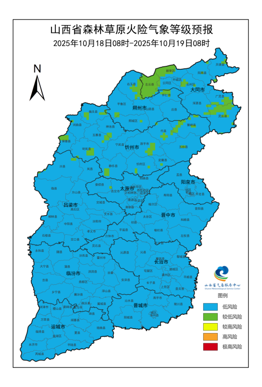 10月19日:大同(广灵、灵丘)、朔州(朔城)、忻州(保德)为高风险,火险气象等级高,须加强火源管理。大同(天镇、左云、新荣)、朔州(右玉)、忻州(代县)为较高风险,火险气象等级较高,须加强防范。大同(阳高、平城、云州、浑源、云冈)、朔州(平鲁、山阴、怀仁、应县)、忻州(河曲、偏关、神池、宁武、繁峙、岢岚、静乐、原平、忻府、定襄、五台、五寨)、太原(娄烦、阳曲、古交)、吕梁(临县、兴县、岚县、柳林)为较低风险,火险气象等级较低。阳泉(盂县、平定、郊区、阳泉城区)、太原(尖草坪、小店、清徐、迎泽、杏花岭、万柏林、晋源)、晋中(祁县、太谷、榆次、平遥、寿阳、昔阳、左权、和顺、灵石、榆社、介休)、吕梁(石楼、方山、离石、中阳、孝义、汾阳、文水、交城、交口)、临汾(永和、隰县、大宁、吉县、襄汾、蒲县、汾西、洪洞、尧都、霍州、古县、安泽、乡宁、曲沃、翼城、浮山、侯马)、长治(武乡、沁县、长子、沁源、黎城、屯留、潞城、上党、襄垣、壶关、平顺、潞州)、晋城(沁水、高平、阳城、晋城城区、陵川、泽州)、运城(稷山、万荣、河津、临猗、盐湖、新绛、绛县、闻喜、垣曲、永济、芮城、夏县、平陆)为低风险,火险气象等级低。