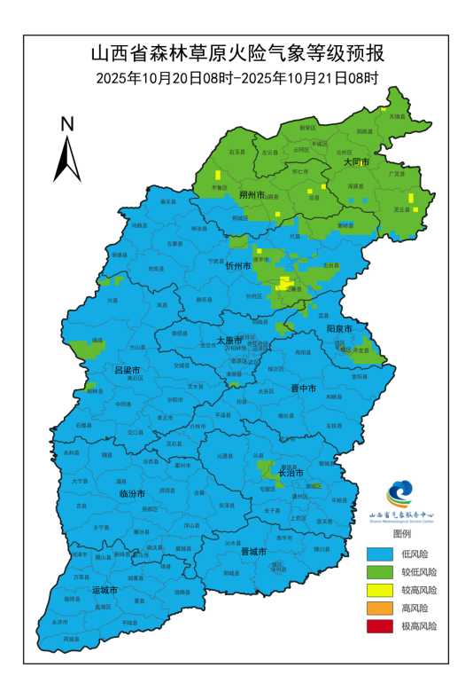 10月20日:大同(云州、天镇、灵丘)、朔州(平鲁、山阴、应县)、忻州(原平、忻府、定襄)为较高风险,火险气象等级较高,须加强防范。大同(阳高、平城、左云、浑源、广灵、新荣、云冈)、朔州(右玉、朔城、怀仁)、忻州(宁武、繁峙、五台、代县)、阳泉(盂县、平定、郊区、阳泉城区)、太原(阳曲、清徐)、吕梁(临县、兴县、柳林)、长治(沁县、屯留、潞城、襄垣)为较低风险,火险气象等级较低。忻州(河曲、偏关、神池、保德、岢岚、静乐、五寨)、太原(娄烦、尖草坪、小店、古交、迎泽、杏花岭、万柏林、晋源)、晋中(祁县、太谷、榆次、平遥、寿阳、昔阳、左权、和顺、灵石、榆社、介休)、吕梁(岚县、石楼、方山、离石、中阳、孝义、汾阳、文水、交城、交口)、临汾(永和、隰县、大宁、吉县、襄汾、蒲县、汾西、洪洞、尧都、霍州、古县、安泽、乡宁、曲沃、翼城、浮山、侯马)、长治(武乡、长子、沁源、黎城、上党、壶关、平顺、潞州)、晋城(沁水、高平、阳城、晋城城区、陵川、泽州)、运城(稷山、万荣、河津、临猗、盐湖、新绛、绛县、闻喜、垣曲、永济、芮城、夏县、平陆)为低风险,火险气象等级低。