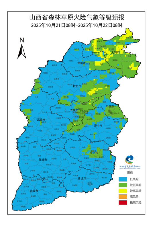 10月21日:大同(阳高、平城、云州、天镇、左云、浑源、广灵、灵丘、新荣、云冈)、朔州(山阴、怀仁、应县)、忻州(原平、忻府、定襄、五台、代县)、太原(阳曲、清徐)为较高风险,火险气象等级较高,须加强防范。朔州(右玉、平鲁)、忻州(繁峙、保德、静乐)、阳泉(盂县、平定、郊区、阳泉城区)、太原(娄烦、尖草坪、小店、古交、迎泽、杏花岭、万柏林、晋源)、晋中(祁县、太谷、榆次、平遥、寿阳、昔阳、和顺、榆社)、吕梁(临县、兴县、岚县、柳林、离石、文水、交城)、长治(武乡、沁县、黎城、屯留、潞城、襄垣、平顺、潞州)为较低风险,火险气象等级较低。朔州(朔城)、忻州(河曲、偏关、神池、宁武、岢岚、五寨)、晋中(左权、灵石、介休)、吕梁(石楼、方山、中阳、孝义、汾阳、交口)、临汾(永和、隰县、大宁、吉县、襄汾、蒲县、汾西、洪洞、尧都、霍州、古县、安泽、乡宁、曲沃、翼城、浮山、侯马)、长治(长子、沁源、上党、壶关)、晋城(沁水、高平、阳城、晋城城区、陵川、泽州)、运城(稷山、万荣、河津、临猗、盐湖、新绛、绛县、闻喜、垣曲、永济、芮城、夏县、平陆)为低风险,火险气象等级低。