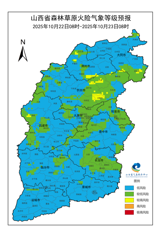 10月22日:大同(天镇、浑源、灵丘)、朔州(右玉、平鲁、山阴、朔城、应县)、忻州(繁峙、原平、忻府、定襄、五台、代县)、吕梁(临县)为较高风险,火险气象等级较高,须加强防范。大同(阳高、左云)、忻州(河曲、偏关、宁武、保德、岢岚、静乐、五寨)、阳泉(盂县、平定、郊区、阳泉城区)、太原(娄烦、尖草坪、阳曲、小店、古交、清徐、迎泽、杏花岭、万柏林、晋源)、晋中(祁县、太谷、榆次、平遥、寿阳、昔阳、左权、和顺、灵石、榆社、介休)、吕梁(兴县、岚县、柳林、石楼、方山、离石、中阳、孝义、文水、交城、交口)、临汾(大宁、吉县、蒲县、汾西、洪洞、尧都、霍州、乡宁)、长治(武乡、沁县、长子、沁源、黎城、屯留、潞城、襄垣、平顺、潞州)、晋城(沁水)、运城(稷山、河津)为较低风险,火险气象等级较低。大同(平城、云州、广灵、新荣、云冈)、朔州(怀仁)、忻州(神池)、吕梁(汾阳)、临汾(永和、隰县、襄汾、古县、安泽、曲沃、翼城、浮山、侯马)、长治(上党、壶关)、晋城(高平、阳城、晋城城区、陵川、泽州)、运城(万荣、临猗、盐湖、新绛、绛县、闻喜、垣曲、永济、芮城、夏县、平陆)为低风险,火险气象等级低。