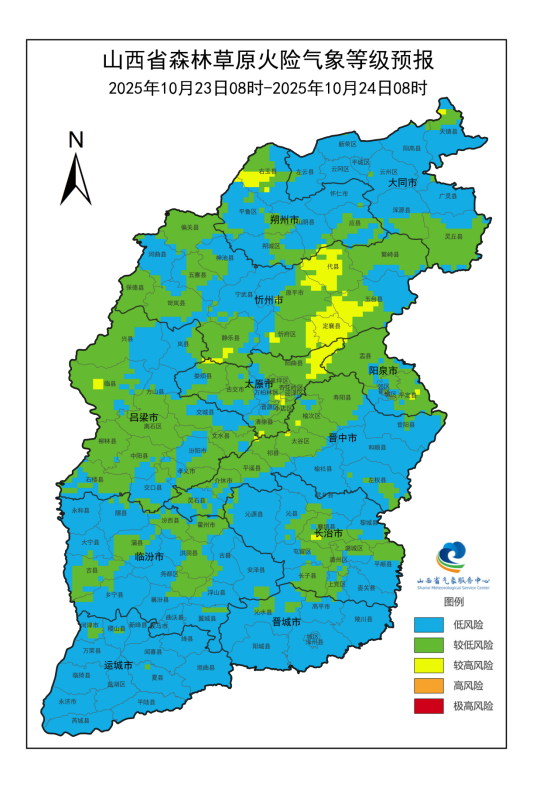 10月23日:大同(天镇)、朔州(右玉、平鲁、山阴)、忻州(静乐、原平、忻府、定襄、五台、代县)、阳泉(盂县、平定)、太原(娄烦、阳曲、小店、清徐、迎泽、万柏林)、晋中(太谷、榆次)、吕梁(临县、文水)、长治(襄垣)为较高风险,火险气象等级较高,须加强防范。大同(阳高、云州、左云、浑源、灵丘)、朔州(朔城、怀仁、应县)、忻州(河曲、偏关、神池、宁武、繁峙、保德、岢岚、五寨)、阳泉(郊区、阳泉城区)、太原(尖草坪、古交、杏花岭、晋源)、晋中(祁县、平遥、寿阳、昔阳、左权、灵石、介休)、吕梁(兴县、岚县、柳林、石楼、方山、离石、中阳、孝义、汾阳、交城、交口)、临汾(隰县、大宁、吉县、襄汾、蒲县、汾西、洪洞、尧都、霍州、古县、安泽、乡宁、翼城、浮山)、长治(武乡、沁县、长子、沁源、黎城、屯留、潞城、上党、平顺、潞州)、晋城(沁水、高平)、运城(稷山、河津、夏县)为较低风险,火险气象等级较低。大同(平城、广灵、新荣、云冈)、晋中(和顺、榆社)、临汾(永和、曲沃、侯马)、长治(壶关)、晋城(阳城、晋城城区、陵川、泽州)、运城(万荣、临猗、盐湖、新绛、绛县、闻喜、垣曲、永济、芮城、平陆)为低风险,火险气象等级低。