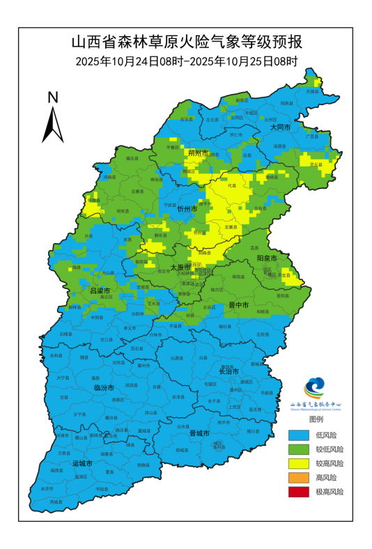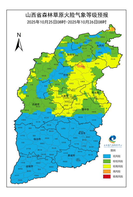 10月25日:大同(天镇)、忻州(代县)为高风险,火险气象等级高,须加强火源管理。大同(阳高、左云、浑源、灵丘)、朔州(右玉、平鲁、山阴、朔城、应县)、忻州(偏关、繁峙、保德、岢岚、静乐、原平、忻府、定襄、五台)、阳泉(盂县、平定、郊区、阳泉城区)、太原(娄烦、尖草坪、阳曲、小店、古交、清徐、迎泽、杏花岭、万柏林、晋源)、晋中(祁县、太谷、榆次、平遥、寿阳、昔阳、和顺)、吕梁(临县、兴县、岚县、汾阳、文水、交城)为较高风险,火险气象等级较高,须加强防范。大同(平城、云州、广灵、新荣、云冈)、朔州(怀仁)、忻州(河曲、神池、宁武、五寨)、晋中(榆社)、吕梁(柳林、方山、离石、中阳)为较低风险,火险气象等级较低。晋中(左权、灵石、介休)、吕梁(石楼、孝义、交口)、临汾(永和、隰县、大宁、吉县、襄汾、蒲县、汾西、洪洞、尧都、霍州、古县、安泽、乡宁、曲沃、翼城、浮山、侯马)、长治(武乡、沁县、长子、沁源、黎城、屯留、潞城、上党、襄垣、壶关、平顺、潞州)、晋城(沁水、高平、阳城、晋城城区、陵川、泽州)、运城(稷山、万荣、河津、临猗、盐湖、新绛、绛县、闻喜、垣曲、永济、芮城、夏县、平陆)为低风险,火险气象等级低。