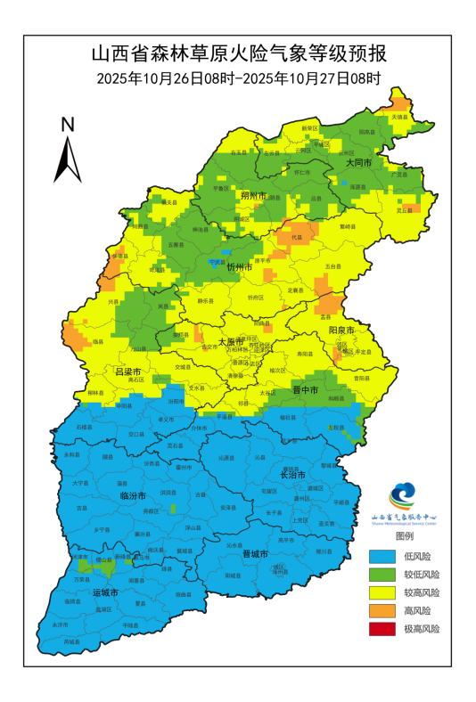 10月26日:大同(阳高、天镇、灵丘)、朔州(平鲁、山阴)、忻州(繁峙、保德、原平、忻府、定襄、五台、代县)、阳泉(盂县、平定、郊区)、太原(娄烦、阳曲、古交)、吕梁(临县、兴县)为高风险,火险气象等级高,须加强火源管理。大同(平城、云州、左云、浑源、广灵、新荣、云冈)、朔州(右玉、朔城、怀仁、应县)、忻州(河曲、偏关、神池、宁武、岢岚、静乐、五寨)、阳泉(阳泉城区)、太原(尖草坪、小店、清徐、迎泽、杏花岭、万柏林、晋源)、晋中(祁县、太谷、榆次、平遥、寿阳、昔阳、和顺)、吕梁(岚县、柳林、方山、离石、中阳、汾阳、文水、交城)为较高风险,火险气象等级较高,须加强防范。晋中(左权、榆社)、临汾(洪洞)、运城(稷山、万荣、河津、新绛)为较低风险,火险气象等级较低。晋中(灵石、介休)、吕梁(石楼、孝义、交口)、临汾(永和、隰县、大宁、吉县、襄汾、蒲县、汾西、尧都、霍州、古县、安泽、乡宁、曲沃、翼城、浮山、侯马)、长治(武乡、沁县、长子、沁源、黎城、屯留、潞城、上党、襄垣、壶关、平顺、潞州)、晋城(沁水、高平、阳城、晋城城区、陵川、泽州)、运城(临猗、盐湖、绛县、闻喜、垣曲、永济、芮城、夏县、平陆)为低风险,火险气象等级低。