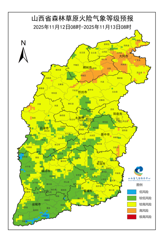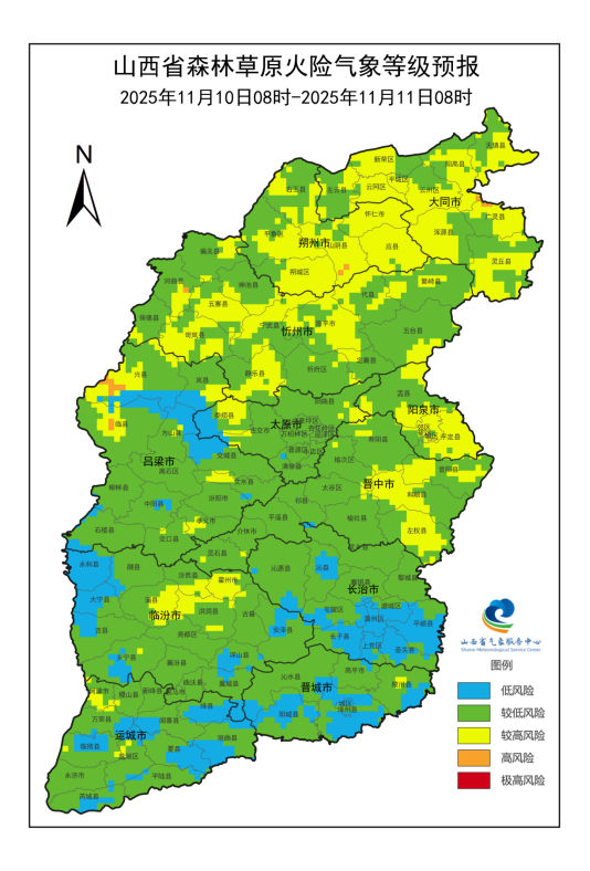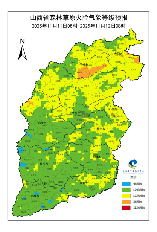 11月11日:大同(阳高、云州、浑源、广灵、灵丘)、朔州(平鲁、山阴、朔城、怀仁、应县)、忻州(河曲、宁武)、晋中(左权)、吕梁(临县、兴县)为高风险,火险气象等级高,须加强火源管理。大同(平城、天镇、左云、新荣、云冈)、朔州(右玉)、忻州(偏关、神池、繁峙、保德、岢岚、静乐、原平、忻府、定襄、五台、代县、五寨)、阳泉(盂县、平定、郊区、阳泉城区)、太原(娄烦、阳曲、小店、古交、清徐)、晋中(祁县、太谷、榆次、平遥、寿阳、昔阳、和顺、灵石、榆社、介休)、吕梁(岚县、石楼、方山、孝义、汾阳、交城、交口)、临汾(隰县、吉县、蒲县、汾西、洪洞、尧都、霍州、古县、安泽、乡宁)、长治(武乡、沁县、长子、沁源、黎城、屯留、潞城、上党、襄垣、壶关、平顺)、晋城(沁水、高平、阳城、陵川、泽州)、运城(河津、临猗、垣曲、永济)为较高风险,火险气象等级较高,须加强防范。太原(尖草坪、迎泽、杏花岭、万柏林、晋源)、吕梁(柳林、离石、中阳、文水)、临汾(永和、大宁、襄汾、曲沃、翼城、浮山、侯马)、长治(潞州)、晋城(晋城城区)、运城(稷山、万荣、盐湖、新绛、绛县、闻喜、芮城、夏县、平陆)为较低风险,火险气象等级较低。