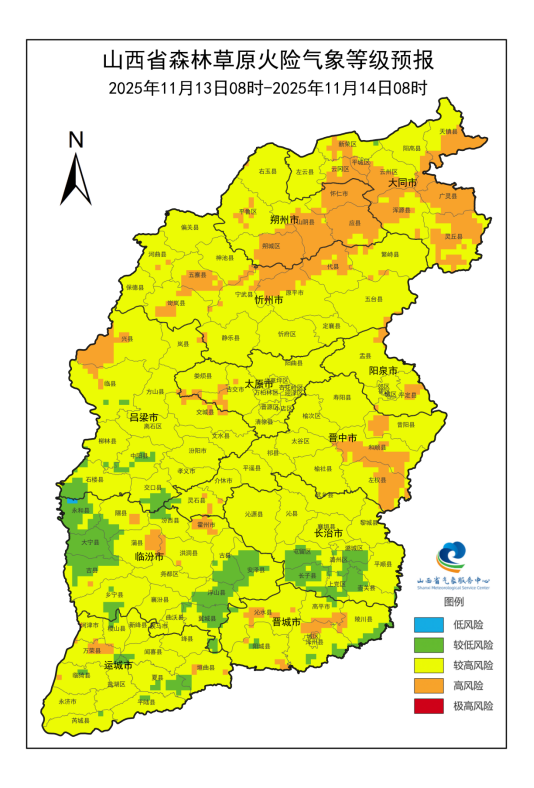 11月13日:大同(阳高、平城、云州、天镇、浑源、广灵、灵丘、新荣、云冈)、朔州(右玉、平鲁、山阴、朔城、怀仁、应县)、忻州(河曲、神池、宁武、繁峙、岢岚、静乐、原平、五台、代县、五寨)、阳泉(盂县、平定)、太原(娄烦、古交)、晋中(榆次、昔阳、左权、和顺、灵石)、吕梁(临县、兴县、岚县、方山、交城)、临汾(隰县、吉县、蒲县、洪洞、霍州)、晋城(沁水、高平、阳城、晋城城区、陵川、泽州)、运城(万荣、临猗、垣曲)为高风险,火险气象等级高,须加强火源管理。大同(左云)、忻州(偏关、保德、忻府、定襄)、阳泉(郊区、阳泉城区)、太原(尖草坪、阳曲、小店、清徐、迎泽、杏花岭、万柏林、晋源)、晋中(祁县、太谷、平遥、寿阳、榆社、介休)、吕梁(柳林、石楼、离石、中阳、孝义、汾阳、文水、交口)、临汾(永和、大宁、襄汾、汾西、尧都、古县、安泽、乡宁、曲沃、翼城、浮山、侯马)、长治(武乡、沁县、长子、沁源、黎城、屯留、潞城、上党、襄垣、壶关、平顺、潞州)、运城(稷山、河津、盐湖、新绛、绛县、闻喜、永济、芮城、夏县、平陆)为较高风险,火险气象等级较高,须加强防范。