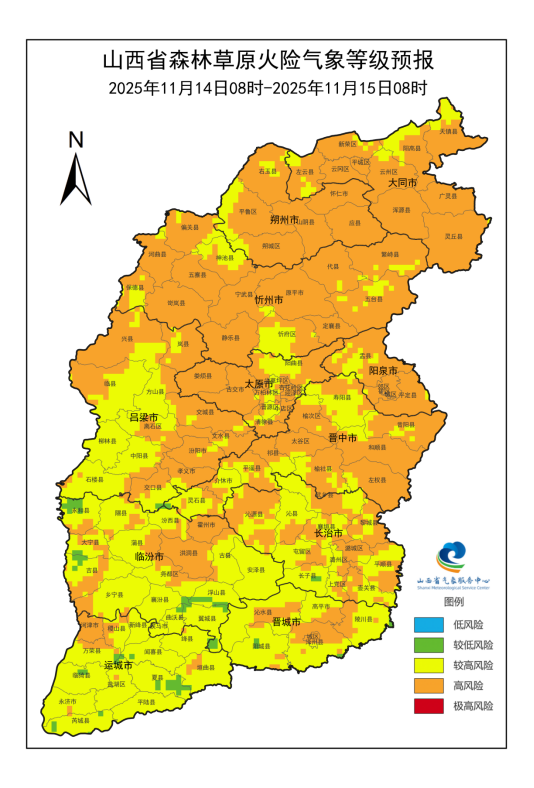 11月14日:大同(阳高、平城、云州、天镇、左云、浑源、广灵、灵丘、新荣、云冈)、朔州(右玉、平鲁、山阴、朔城、怀仁、应县)、忻州(河曲、偏关、神池、宁武、繁峙、保德、岢岚、静乐、原平、忻府、定襄、五台、代县、五寨)、阳泉(盂县、平定、郊区、阳泉城区)、太原(娄烦、尖草坪、阳曲、小店、古交、清徐、迎泽、杏花岭、万柏林、晋源)、晋中(祁县、太谷、榆次、平遥、寿阳、昔阳、左权、和顺、灵石、榆社、介休)、吕梁(临县、兴县、岚县、石楼、方山、离石、中阳、孝义、汾阳、文水、交城、交口)、临汾(永和、隰县、大宁、吉县、蒲县、汾西、洪洞、尧都、霍州、古县、乡宁)、长治(武乡、沁县、长子、沁源、黎城、屯留、潞城、上党、襄垣、壶关、平顺、潞州)、晋城(沁水、高平、阳城、晋城城区、陵川、泽州)、运城(稷山、万荣、河津、盐湖、绛县、垣曲、永济、芮城)为高风险,火险气象等级高,须加强火源管理。吕梁(柳林)、临汾(襄汾、安泽、曲沃、翼城、浮山、侯马)、运城(临猗、新绛、闻喜、夏县、平陆)为较高风险,火险气象等级较高,须加强防范。