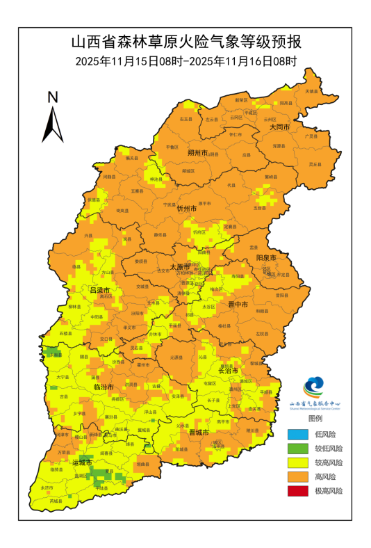 11月15日:大同(阳高、平城、云州、天镇、左云、浑源、广灵、灵丘、新荣、云冈)、朔州(右玉、平鲁、山阴、朔城、怀仁、应县)、忻州(河曲、偏关、神池、宁武、繁峙、保德、岢岚、静乐、原平、忻府、定襄、五台、代县、五寨)、阳泉(盂县、平定、郊区、阳泉城区)、太原(娄烦、尖草坪、阳曲、小店、古交、清徐、迎泽、杏花岭、万柏林、晋源)、晋中(祁县、太谷、榆次、平遥、寿阳、昔阳、左权、和顺、灵石、榆社、介休)、吕梁(临县、兴县、岚县、柳林、石楼、方山、离石、中阳、孝义、汾阳、文水、交城、交口)、临汾(隰县、吉县、襄汾、蒲县、汾西、洪洞、尧都、霍州、古县、安泽、乡宁)、长治(武乡、沁县、沁源、黎城、屯留、潞城、上党、襄垣、壶关、平顺、潞州)、晋城(沁水、高平、阳城、晋城城区、陵川、泽州)、运城(稷山、万荣、河津、临猗、新绛、垣曲、永济、夏县)为高风险,火险气象等级高,须加强火源管理。临汾(永和、大宁、曲沃、翼城、浮山、侯马)、长治(长子)、运城(盐湖、绛县、闻喜、芮城、平陆)为较高风险,火险气象等级较高,须加强防范。