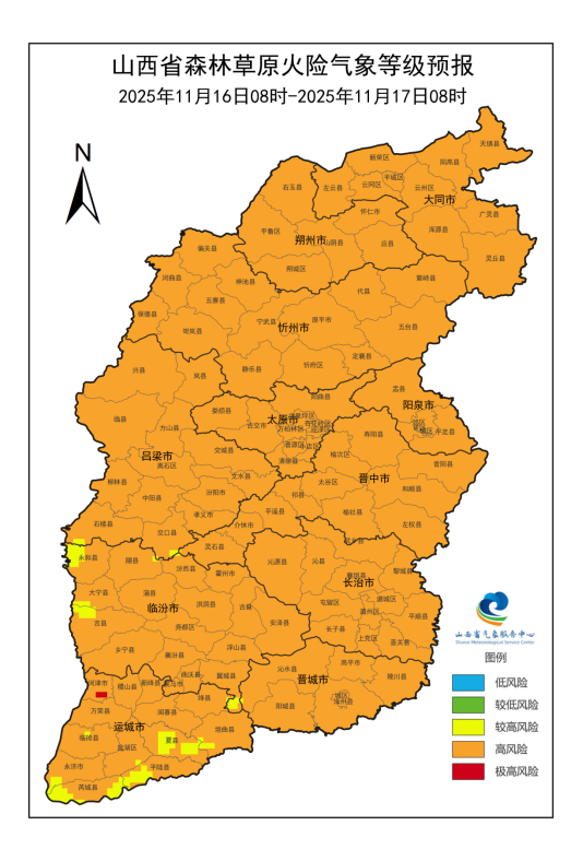 11月16日:运城(河津)为极高风险,火险气象等级极高,严禁一切野外用火。大同(阳高、平城、云州、天镇、左云、浑源、广灵、灵丘、新荣、云冈)、朔州(右玉、平鲁、山阴、朔城、怀仁、应县)、忻州(河曲、偏关、神池、宁武、繁峙、保德、岢岚、静乐、原平、忻府、定襄、五台、代县、五寨)、阳泉(盂县、平定、郊区、阳泉城区)、太原(娄烦、尖草坪、阳曲、小店、古交、清徐、迎泽、杏花岭、万柏林、晋源)、晋中(祁县、太谷、榆次、平遥、寿阳、昔阳、左权、和顺、灵石、榆社、介休)、吕梁(临县、兴县、岚县、柳林、石楼、方山、离石、中阳、孝义、汾阳、文水、交城、交口)、临汾(永和、隰县、大宁、吉县、襄汾、蒲县、汾西、洪洞、尧都、霍州、古县、安泽、乡宁、曲沃、翼城、浮山、侯马)、长治(武乡、沁县、长子、沁源、黎城、屯留、潞城、上党、襄垣、壶关、平顺、潞州)、晋城(沁水、高平、阳城、晋城城区、陵川、泽州)、运城(稷山、万荣、临猗、盐湖、新绛、绛县、闻喜、垣曲、永济、芮城、夏县、平陆)为高风险,火险气象等级高,须加强火源管理。