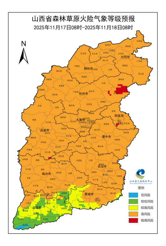 11月17日:忻州(繁峙、五台)、阳泉(郊区)、吕梁(交口)为极高风险,火险气象等级极高,严禁一切野外用火。大同(阳高、平城、云州、天镇、左云、浑源、广灵、灵丘、新荣、云冈)、朔州(右玉、平鲁、山阴、朔城、怀仁、应县)、忻州(河曲、偏关、神池、宁武、保德、岢岚、静乐、原平、忻府、定襄、代县、五寨)、阳泉(盂县、平定、阳泉城区)、太原(娄烦、尖草坪、阳曲、小店、古交、清徐、迎泽、杏花岭、万柏林、晋源)、晋中(祁县、太谷、榆次、平遥、寿阳、昔阳、左权、和顺、灵石、榆社、介休)、吕梁(临县、兴县、岚县、柳林、石楼、方山、离石、中阳、孝义、汾阳、文水、交城)、临汾(永和、隰县、大宁、吉县、襄汾、蒲县、汾西、洪洞、尧都、霍州、古县、安泽、乡宁、曲沃、翼城、浮山、侯马)、长治(武乡、沁县、长子、沁源、黎城、屯留、潞城、上党、襄垣、壶关、平顺、潞州)、晋城(沁水、高平、阳城、晋城城区、陵川、泽州)、运城(稷山、万荣、河津、临猗、新绛、绛县、闻喜)为高风险,火险气象等级高,须加强火源管理。运城(盐湖、垣曲、永济、夏县、平陆)为较高风险,火险气象等级较高,须加强防范。运城(芮城)为较低风险,火险气象等级较低。