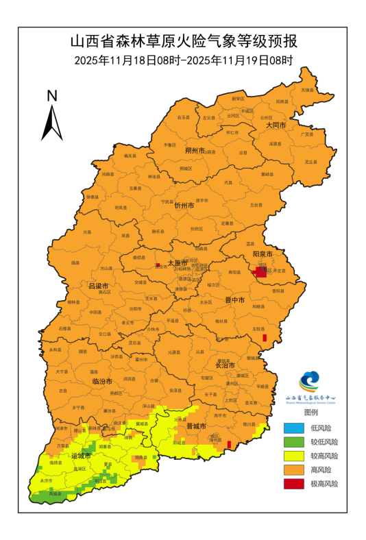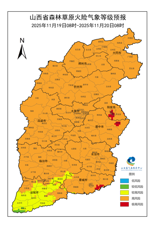 11月19日:阳泉(平定、郊区、阳泉城区)、晋中(昔阳)、晋城(陵川、泽州)为极高风险,火险气象等级极高,严禁一切野外用火。大同(阳高、平城、云州、天镇、左云、浑源、广灵、灵丘、新荣、云冈)、朔州(右玉、平鲁、山阴、朔城、怀仁、应县)、忻州(河曲、偏关、神池、宁武、繁峙、保德、岢岚、静乐、原平、忻府、定襄、五台、代县、五寨)、阳泉(盂县)、太原(娄烦、尖草坪、阳曲、小店、古交、清徐、迎泽、杏花岭、万柏林、晋源)、晋中(祁县、太谷、榆次、平遥、寿阳、左权、和顺、灵石、榆社、介休)、吕梁(临县、兴县、岚县、柳林、石楼、方山、离石、中阳、孝义、汾阳、文水、交城、交口)、临汾(永和、隰县、大宁、吉县、襄汾、蒲县、汾西、洪洞、尧都、霍州、古县、安泽、乡宁、曲沃、翼城、浮山、侯马)、长治(武乡、沁县、长子、沁源、黎城、屯留、潞城、上党、襄垣、壶关、平顺、潞州)、晋城(沁水、高平、阳城、晋城城区)、运城(稷山、万荣、河津、临猗、盐湖、新绛、绛县、闻喜、垣曲、夏县)为高风险,火险气象等级高,须加强火源管理。运城(永济、芮城、平陆)为较高风险,火险气象等级较高,须加强防范。