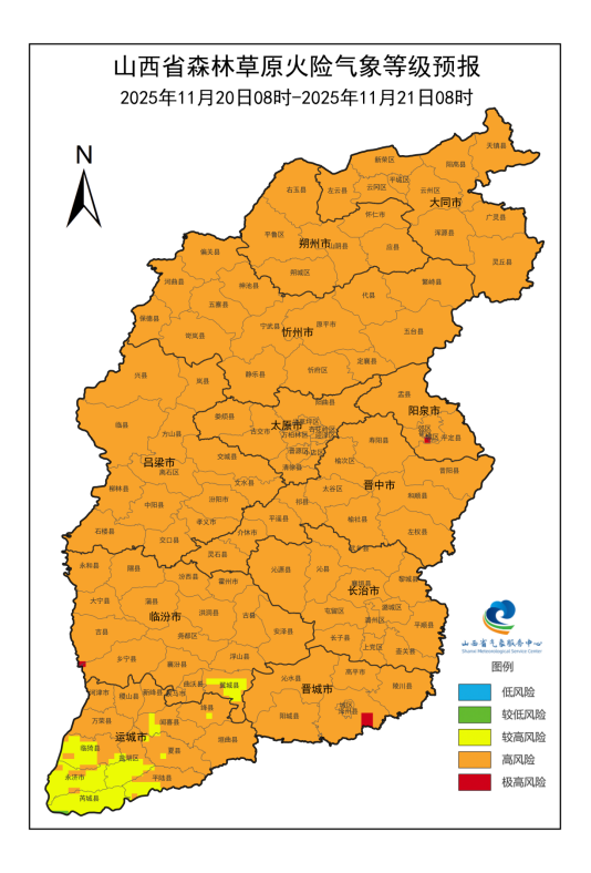 11月20日:阳泉(郊区)、临汾(乡宁)、晋城(泽州)为极高风险,火险气象等级极高,严禁一切野外用火。大同(阳高、平城、云州、天镇、左云、浑源、广灵、灵丘、新荣、云冈)、朔州(右玉、平鲁、山阴、朔城、怀仁、应县)、忻州(河曲、偏关、神池、宁武、繁峙、保德、岢岚、静乐、原平、忻府、定襄、五台、代县、五寨)、阳泉(盂县、平定、阳泉城区)、太原(娄烦、尖草坪、阳曲、小店、古交、清徐、迎泽、杏花岭、万柏林、晋源)、晋中(祁县、太谷、榆次、平遥、寿阳、昔阳、左权、和顺、灵石、榆社、介休)、吕梁(临县、兴县、岚县、柳林、石楼、方山、离石、中阳、孝义、汾阳、文水、交城、交口)、临汾(永和、隰县、大宁、吉县、襄汾、蒲县、汾西、洪洞、尧都、霍州、古县、安泽、曲沃、翼城、浮山、侯马)、长治(武乡、沁县、长子、沁源、黎城、屯留、潞城、上党、襄垣、壶关、平顺、潞州)、晋城(沁水、高平、阳城、晋城城区、陵川)、运城(稷山、万荣、河津、临猗、盐湖、新绛、绛县、闻喜、垣曲、永济、芮城、夏县、平陆)为高风险,火险气象等级高,须加强火源管理。