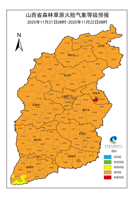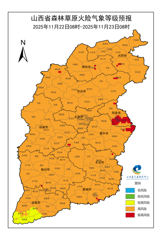11月22日:大同(浑源)、朔州(山阴)、忻州(偏关、繁峙)、阳泉(盂县、平定、郊区、阳泉城区)、晋中(寿阳、昔阳、介休)、临汾(襄汾)、长治(黎城、平顺)、晋城(泽州)为极高风险,火险气象等级极高,严禁一切野外用火。大同(阳高、平城、云州、天镇、左云、广灵、灵丘、新荣、云冈)、朔州(右玉、平鲁、朔城、怀仁、应县)、忻州(河曲、神池、宁武、保德、岢岚、静乐、原平、忻府、定襄、五台、代县、五寨)、太原(娄烦、尖草坪、阳曲、小店、古交、清徐、迎泽、杏花岭、万柏林、晋源)、晋中(祁县、太谷、榆次、平遥、左权、和顺、灵石、榆社)、吕梁(临县、兴县、岚县、柳林、石楼、方山、离石、中阳、孝义、汾阳、文水、交城、交口)、临汾(永和、隰县、大宁、吉县、蒲县、汾西、洪洞、尧都、霍州、古县、安泽、乡宁、曲沃、翼城、浮山、侯马)、长治(武乡、沁县、长子、沁源、屯留、潞城、上党、襄垣、壶关、潞州)、晋城(沁水、高平、阳城、晋城城区、陵川)、运城(稷山、万荣、河津、临猗、盐湖、新绛、绛县、闻喜、垣曲、永济、芮城、夏县、平陆)为高风险,火险气象等级高,须加强火源管理。