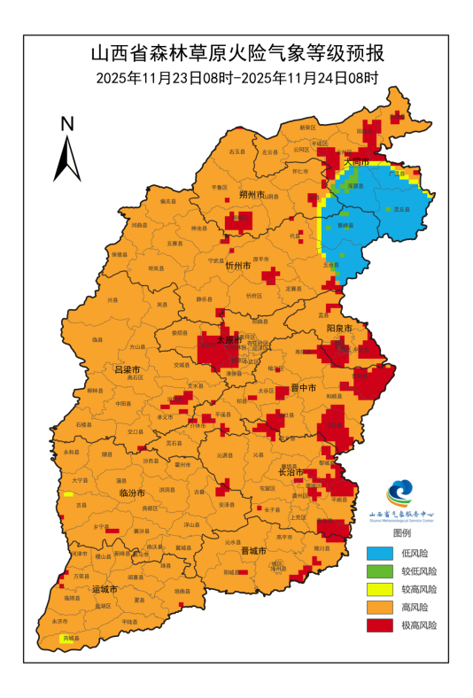 11月23日:大同(阳高、平城、云州、天镇、广灵、云冈)、朔州(平鲁、朔城、怀仁、应县)、忻州(宁武、静乐、原平、忻府、定襄、五台、代县)、阳泉(盂县、平定、郊区、阳泉城区)、太原(娄烦、尖草坪、阳曲、古交、清徐、万柏林、晋源)、晋中(太谷、榆次、平遥、寿阳、昔阳、左权、和顺、榆社、介休)、吕梁(孝义、汾阳、文水、交城、交口)、临汾(吉县、安泽、乡宁)、长治(武乡、长子、沁源、黎城、潞城、襄垣、壶关、平顺)、晋城(阳城、陵川、泽州)、运城(万荣、垣曲)为极高风险,火险气象等级极高,严禁一切野外用火。大同(左云、浑源、灵丘、新荣)、朔州(右玉、山阴)、忻州(河曲、偏关、神池、繁峙、保德、岢岚、五寨)、太原(小店、迎泽、杏花岭)、晋中(祁县、灵石)、吕梁(临县、兴县、岚县、柳林、石楼、方山、离石、中阳)、临汾(永和、隰县、大宁、襄汾、蒲县、汾西、洪洞、尧都、霍州、古县、曲沃、翼城、浮山、侯马)、长治(沁县、屯留、上党、潞州)、晋城(沁水、高平、晋城城区)、运城(稷山、河津、临猗、盐湖、新绛、绛县、闻喜、永济、芮城、夏县、平陆)为高风险,火险气象等级高,须加强火源管理。