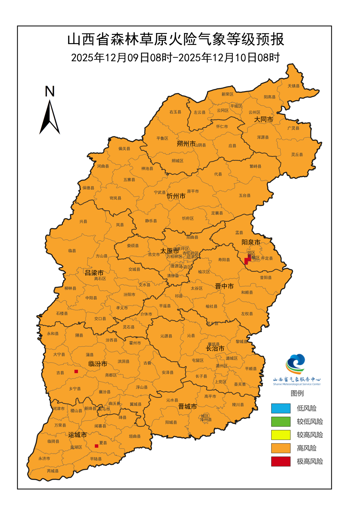 12月9日:阳泉(郊区)、临汾(吉县)、运城(夏县)为极高风险,火险气象等级极高,严禁一切野外用火。大同(阳高、平城、云州、天镇、左云、浑源、广灵、灵丘、新荣、云冈)、朔州(右玉、平鲁、山阴、朔城、怀仁、应县)、忻州(河曲、偏关、神池、宁武、繁峙、保德、岢岚、静乐、原平、忻府、定襄、五台、代县、五寨)、阳泉(盂县、平定、阳泉城区)、太原(娄烦、尖草坪、阳曲、小店、古交、清徐、迎泽、杏花岭、万柏林、晋源)、晋中(祁县、太谷、榆次、平遥、寿阳、昔阳、左权、和顺、灵石、榆社、介休)、吕梁(临县、兴县、岚县、柳林、石楼、方山、离石、中阳、孝义、汾阳、文水、交城、交口)、临汾(永和、隰县、大宁、襄汾、蒲县、汾西、洪洞、尧都、霍州、古县、安泽、乡宁、曲沃、翼城、浮山、侯马)、长治(武乡、沁县、长子、沁源、黎城、屯留、潞城、上党、襄垣、壶关、平顺、潞州)、晋城(沁水、高平、阳城、晋城城区、陵川、泽州)、运城(稷山、万荣、河津、临猗、盐湖、新绛、绛县、闻喜、垣曲、永济、芮城、平陆)为高风险,火险气象等级高,须加强火源管理。