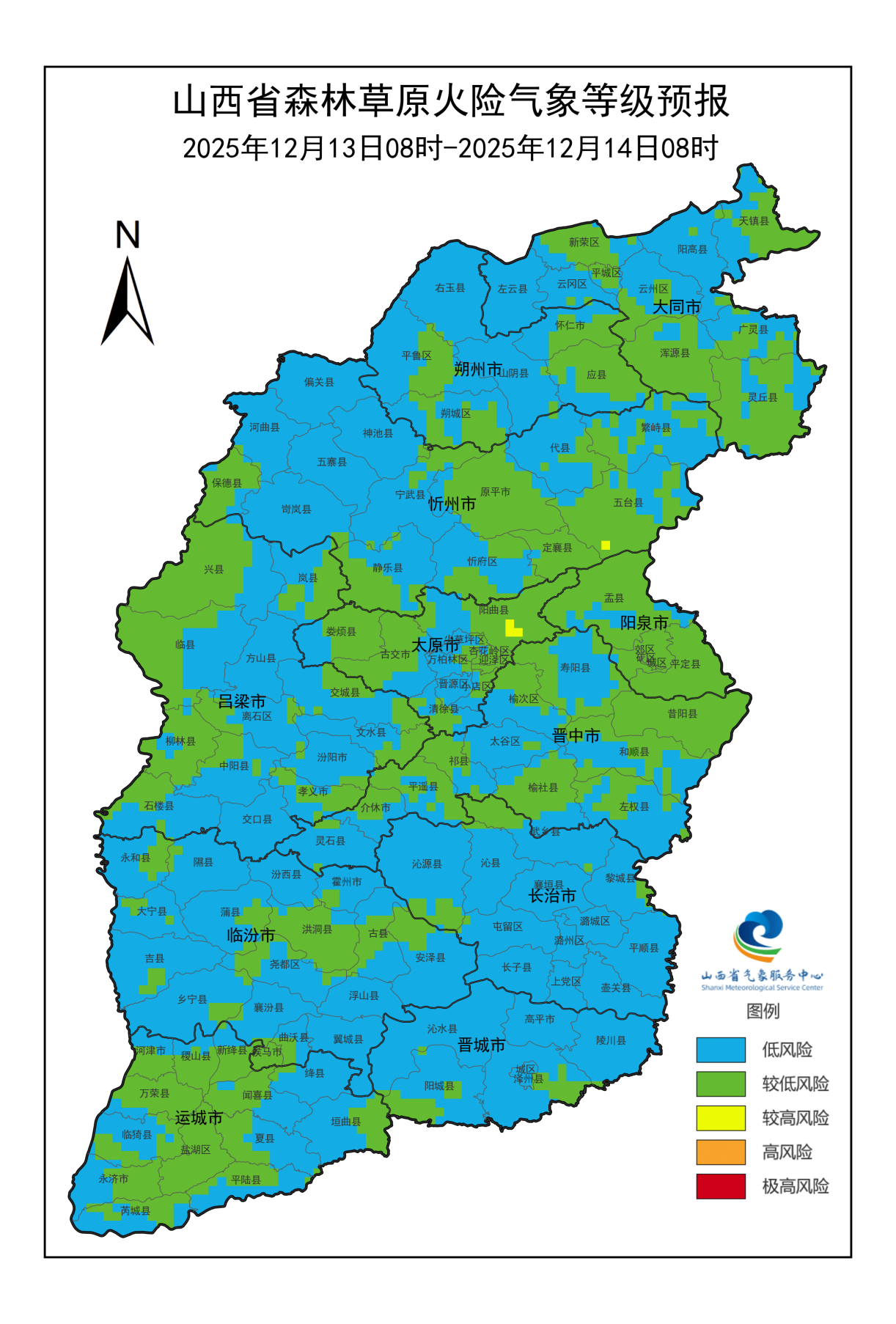 12月13日:忻州(五台)、太原(阳曲)为较高风险,火险气象等级较高,须加强防范。大同(阳高、平城、云州、天镇、浑源、广灵、灵丘、新荣、云冈)、朔州(右玉、平鲁、山阴、朔城、怀仁、应县)、忻州(河曲、神池、宁武、繁峙、保德、岢岚、静乐、原平、忻府、定襄、代县)、阳泉(盂县、平定、郊区、阳泉城区)、太原(娄烦、尖草坪、小店、古交、清徐、迎泽、杏花岭、万柏林)、晋中(祁县、太谷、榆次、平遥、寿阳、昔阳、左权、和顺、灵石、榆社、介休)、吕梁(临县、兴县、岚县、柳林、石楼、方山、离石、中阳、孝义、汾阳、文水、交城)、临汾(永和、隰县、大宁、吉县、襄汾、蒲县、汾西、洪洞、尧都、霍州、古县、安泽、乡宁、曲沃、侯马)、长治(武乡、沁县、沁源、黎城、屯留)、晋城(沁水、阳城、陵川、泽州)、运城(稷山、万荣、河津、临猗、盐湖、新绛、绛县、闻喜、垣曲、永济、芮城、夏县、平陆)为较低风险,火险气象等级较低。大同(左云)、忻州(偏关、五寨)、太原(晋源)、吕梁(交口)、临汾(翼城、浮山)、长治(长子、潞城、上党、襄垣、壶关、平顺、潞州)、晋城(高平、晋城城区)为低风险,火险气象等级低。