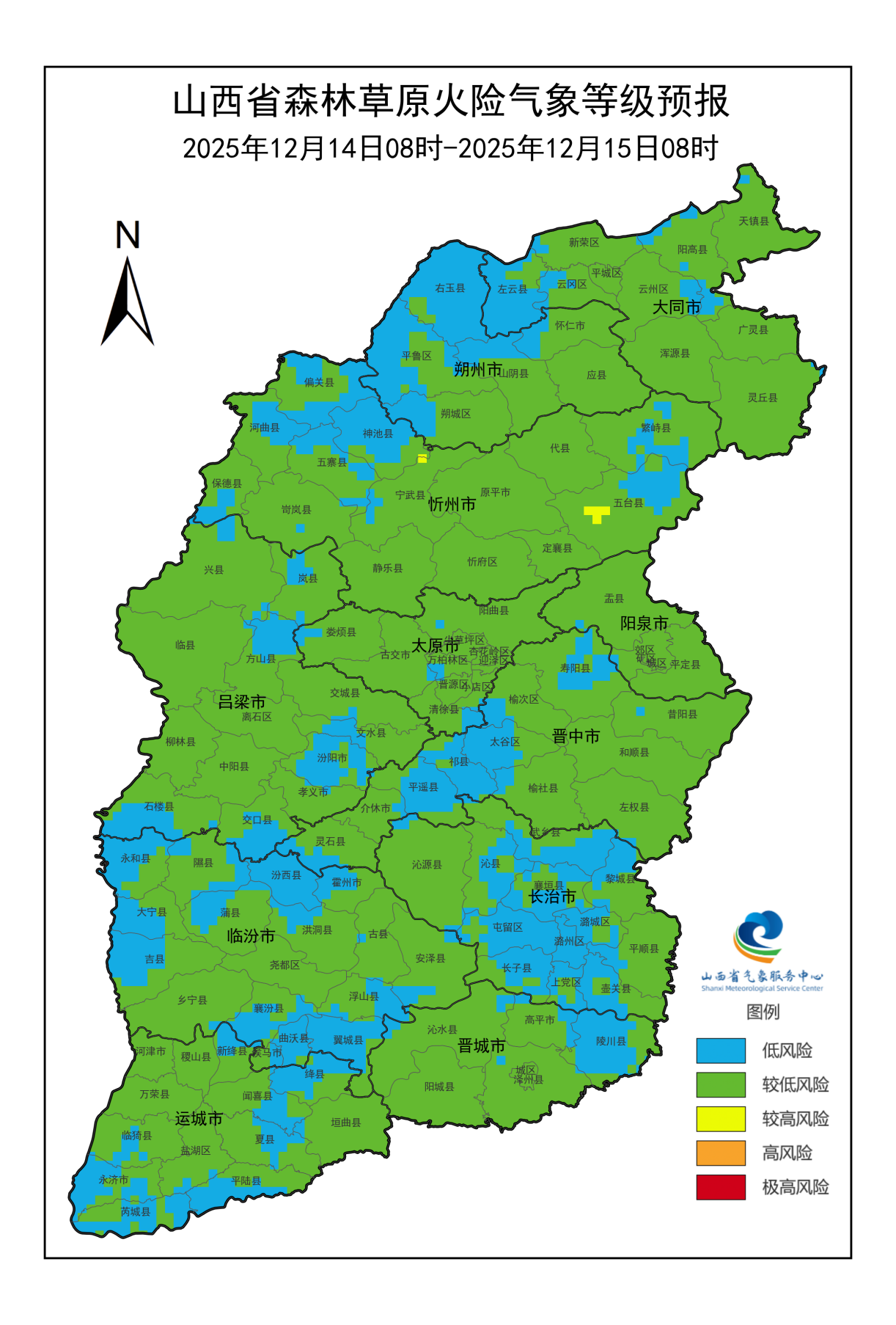 12月14日:忻州(宁武、五台)为较高风险,火险气象等级较高,须加强防范。大同(阳高、平城、云州、天镇、左云、浑源、广灵、灵丘、新荣、云冈)、朔州(右玉、平鲁、山阴、朔城、怀仁、应县)、忻州(河曲、偏关、神池、繁峙、保德、岢岚、静乐、原平、忻府、定襄、代县、五寨)、阳泉(盂县、平定、郊区、阳泉城区)、太原(娄烦、尖草坪、阳曲、小店、古交、清徐、迎泽、杏花岭、万柏林、晋源)、晋中(祁县、太谷、榆次、平遥、寿阳、昔阳、左权、和顺、灵石、榆社、介休)、吕梁(临县、兴县、岚县、柳林、石楼、方山、离石、中阳、孝义、汾阳、文水、交城、交口)、临汾(永和、隰县、大宁、吉县、襄汾、蒲县、洪洞、尧都、霍州、古县、安泽、乡宁、曲沃、翼城、浮山、侯马)、长治(武乡、沁县、长子、沁源、黎城、屯留、潞城、上党、襄垣、壶关、平顺)、晋城(沁水、高平、阳城、晋城城区、陵川、泽州)、运城(稷山、万荣、河津、临猗、盐湖、新绛、绛县、闻喜、垣曲、永济、芮城、夏县、平陆)为较低风险,火险气象等级较低。临汾(汾西)、长治(潞州)为低风险,火险气象等级低。