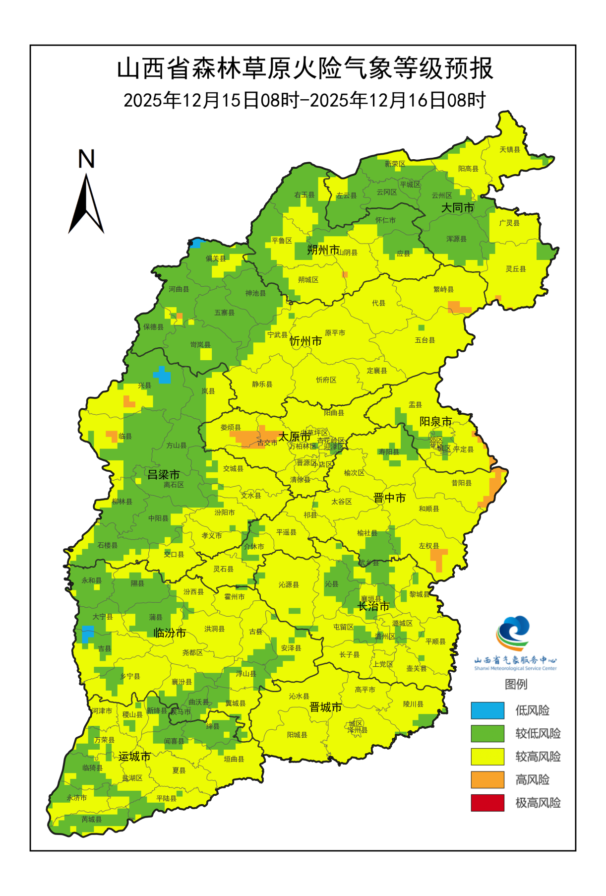 12月15日:大同(灵丘)、朔州(山阴)、忻州(河曲、繁峙、五台)、阳泉(平定)、太原(娄烦、古交)、晋中(昔阳、左权)、吕梁(临县、兴县)为高风险,火险气象等级高,须加强火源管理。大同(阳高、云州、天镇、左云、浑源、广灵、新荣)、朔州(右玉、平鲁、朔城、怀仁、应县)、忻州(偏关、神池、宁武、保德、岢岚、静乐、原平、忻府、定襄、代县)、阳泉(盂县、郊区)、太原(尖草坪、阳曲、小店、清徐、迎泽、杏花岭、万柏林、晋源)、晋中(祁县、太谷、榆次、平遥、寿阳、和顺、灵石、榆社、介休)、吕梁(岚县、柳林、石楼、离石、中阳、孝义、汾阳、文水、交城、交口)、临汾(永和、隰县、大宁、吉县、襄汾、蒲县、汾西、洪洞、尧都、霍州、古县、安泽、乡宁、曲沃、翼城、浮山)、长治(武乡、沁县、长子、沁源、黎城、屯留、潞城、上党、襄垣、壶关、平顺、潞州)、晋城(沁水、高平、阳城、晋城城区、陵川、泽州)、运城(稷山、万荣、河津、临猗、盐湖、新绛、绛县、闻喜、垣曲、永济、芮城、夏县、平陆)为较高风险,火险气象等级较高,须加强防范。大同(平城、云冈)、忻州(五寨)、阳泉(阳泉城区)、吕梁(方山)、临汾(侯马)为较低风险,火险气象等级较低。