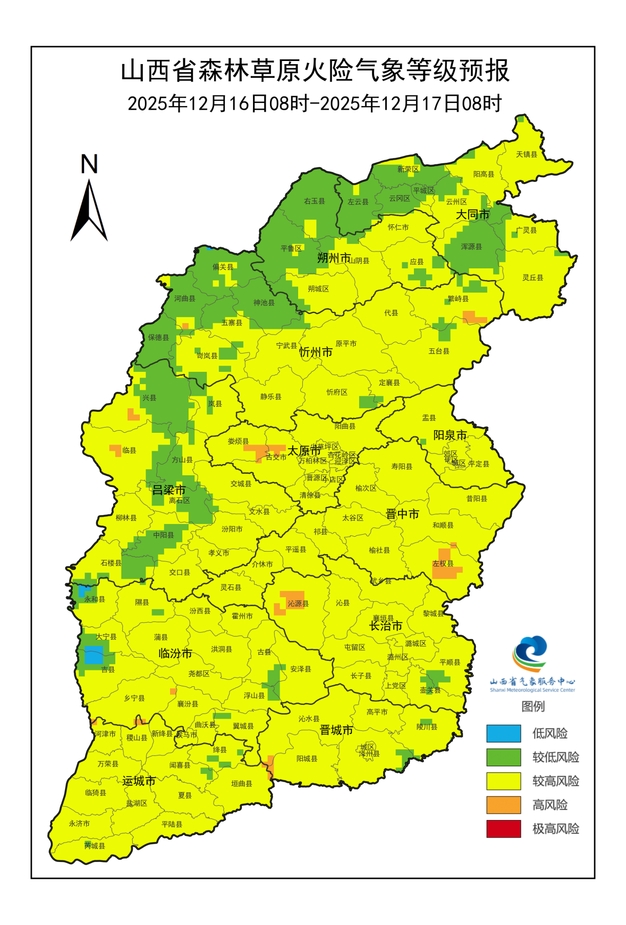 12月16日:忻州(河曲、繁峙、五台)、太原(娄烦、古交)、晋中(左权)、吕梁(临县、兴县)、临汾(乡宁)、长治(沁源)、晋城(沁水、阳城)、运城(稷山、河津、垣曲)为高风险,火险气象等级高,须加强火源管理。大同(阳高、平城、云州、天镇、左云、浑源、广灵、灵丘、新荣、云冈)、朔州(右玉、平鲁、山阴、朔城、怀仁、应县)、忻州(偏关、神池、宁武、保德、岢岚、静乐、原平、忻府、定襄、代县、五寨)、阳泉(盂县、平定、郊区、阳泉城区)、太原(尖草坪、阳曲、小店、清徐、迎泽、杏花岭、万柏林、晋源)、晋中(祁县、太谷、榆次、平遥、寿阳、昔阳、和顺、灵石、榆社、介休)、吕梁(岚县、柳林、石楼、方山、离石、中阳、孝义、汾阳、文水、交城、交口)、临汾(永和、隰县、大宁、吉县、襄汾、蒲县、汾西、洪洞、尧都、霍州、古县、安泽、曲沃、翼城、浮山、侯马)、长治(武乡、沁县、长子、黎城、屯留、潞城、上党、襄垣、壶关、平顺、潞州)、晋城(高平、晋城城区、陵川、泽州)、运城(万荣、临猗、盐湖、新绛、绛县、闻喜、永济、芮城、夏县、平陆)为较高风险,火险气象等级较高,须加强防范。