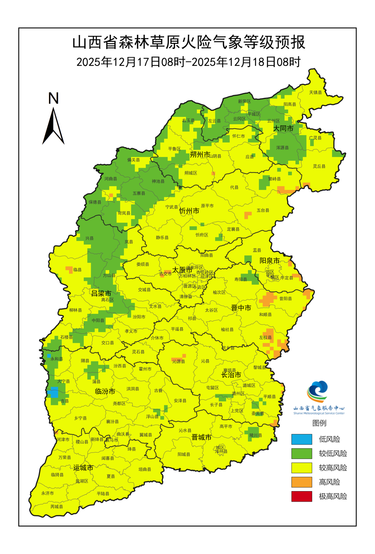 12月17日:大同(灵丘)、朔州(朔城)、忻州(河曲、繁峙、五台)、阳泉(平定)、太原(古交)、晋中(昔阳、左权)、吕梁(临县)、长治(沁源、壶关、平顺)、运城(河津)为高风险,火险气象等级高,须加强火源管理。大同(阳高、平城、云州、天镇、左云、浑源、广灵、新荣、云冈)、朔州(右玉、平鲁、山阴、怀仁、应县)、忻州(偏关、神池、宁武、保德、岢岚、静乐、原平、忻府、定襄、代县、五寨)、阳泉(盂县、郊区、阳泉城区)、太原(娄烦、尖草坪、阳曲、小店、清徐、迎泽、杏花岭、万柏林、晋源)、晋中(祁县、太谷、榆次、平遥、寿阳、和顺、灵石、榆社、介休)、吕梁(兴县、岚县、柳林、石楼、方山、离石、中阳、孝义、汾阳、文水、交城、交口)、临汾(永和、隰县、大宁、吉县、襄汾、蒲县、汾西、洪洞、尧都、霍州、古县、安泽、乡宁、曲沃、翼城、浮山、侯马)、长治(武乡、沁县、长子、黎城、屯留、潞城、上党、襄垣、潞州)、晋城(沁水、高平、阳城、晋城城区、陵川、泽州)、运城(稷山、万荣、临猗、盐湖、新绛、绛县、闻喜、垣曲、永济、芮城、夏县、平陆)为较高风险,火险气象等级较高,须加强防范。