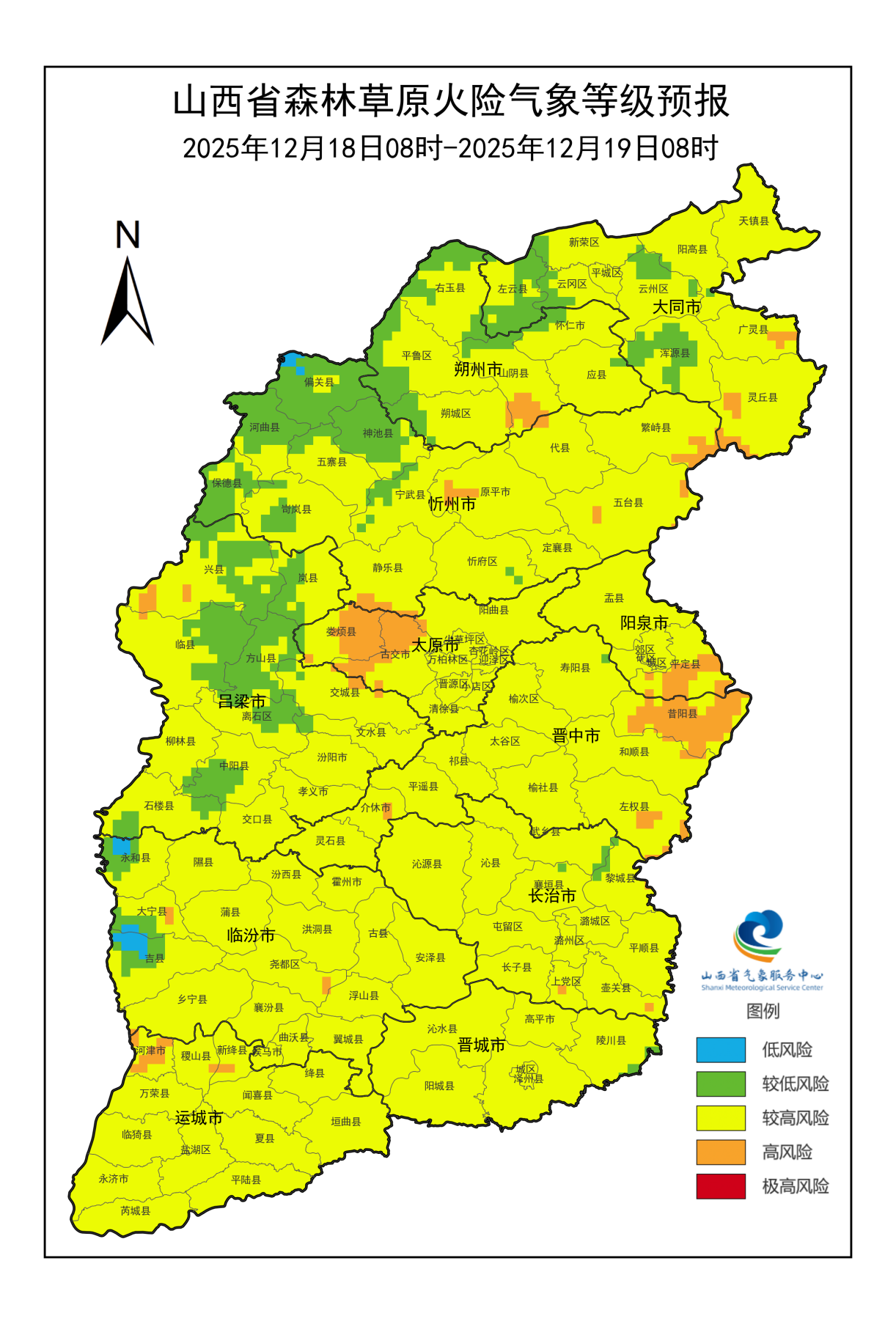 12月18日:大同(广灵、灵丘)、朔州(山阴、朔城)、忻州(繁峙、静乐、原平、五台、代县)、阳泉(平定)、太原(娄烦、阳曲、古交)、晋中(昔阳、左权、和顺、介休)、吕梁(临县、兴县、交城)、临汾(大宁、尧都)、长治(上党、壶关)、运城(稷山、河津、新绛)为高风险,火险气象等级高,须加强火源管理。大同(阳高、平城、云州、天镇、左云、浑源、新荣、云冈)、朔州(右玉、平鲁、怀仁、应县)、忻州(河曲、偏关、神池、宁武、保德、岢岚、忻府、定襄、五寨)、阳泉(盂县、郊区、阳泉城区)、太原(尖草坪、小店、清徐、迎泽、杏花岭、万柏林、晋源)、晋中(祁县、太谷、榆次、平遥、寿阳、灵石、榆社)、吕梁(岚县、柳林、石楼、方山、离石、中阳、孝义、汾阳、文水、交口)、临汾(永和、隰县、吉县、襄汾、蒲县、汾西、洪洞、霍州、古县、安泽、乡宁、曲沃、翼城、浮山、侯马)、长治(武乡、沁县、长子、沁源、黎城、屯留、潞城、襄垣、平顺、潞州)、晋城(沁水、高平、阳城、晋城城区、陵川、泽州)、运城(万荣、临猗、盐湖、绛县、闻喜、垣曲、永济、芮城、夏县、平陆)为较高风险,火险气象等级较高,须加强防范。