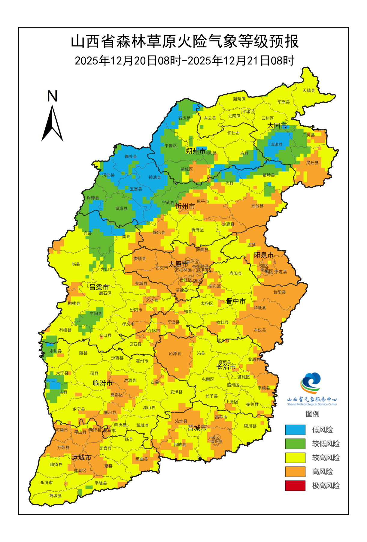 12月20日:大同(广灵、灵丘)、朔州(山阴、朔城)、忻州(宁武、繁峙、静乐、原平、忻府、定襄、五台、代县)、阳泉(盂县、平定、郊区、阳泉城区)、太原(娄烦、尖草坪、阳曲、小店、古交、清徐、迎泽、杏花岭、万柏林、晋源)、晋中(祁县、太谷、榆次、平遥、寿阳、昔阳、左权、和顺、灵石、榆社、介休)、吕梁(临县、兴县、岚县、柳林、石楼、离石、孝义、汾阳、文水、交城、交口)、临汾(永和、大宁、吉县、襄汾、蒲县、洪洞、尧都、霍州、古县、安泽、乡宁、曲沃、翼城、侯马)、长治(武乡、沁县、沁源、黎城、上党、襄垣、壶关、平顺)、晋城(沁水、高平、阳城、晋城城区、陵川、泽州)、运城(稷山、万荣、河津、临猗、盐湖、新绛、闻喜、垣曲、夏县、平陆)为高风险,火险气象等级高,须加强火源管理。大同(阳高、平城、云州、天镇、左云、浑源、新荣、云冈)、朔州(右玉、平鲁、怀仁、应县)、忻州(河曲)、吕梁(方山、中阳)、临汾(隰县、汾西、浮山)、长治(长子、屯留、潞城、潞州)、运城(绛县、永济、芮城)为较高风险,火险气象等级较高,须加强防范。忻州(偏关、神池、保德、岢岚、五寨)为较低风险,火险气象等级较低。