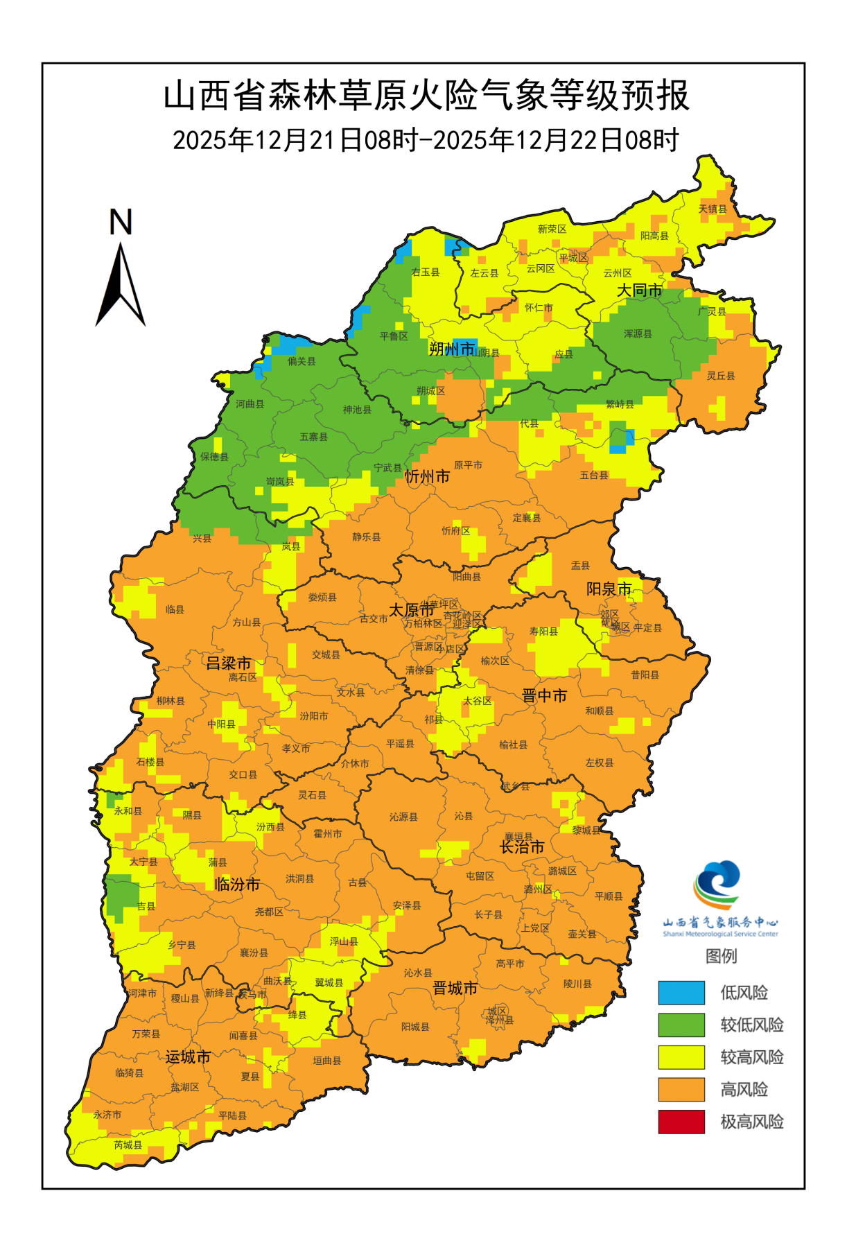 12月21日:大同(阳高、平城、云州、天镇、左云、广灵、灵丘、新荣、云冈)、朔州(山阴、朔城、怀仁、应县)、忻州(宁武、繁峙、静乐、原平、忻府、定襄、五台、代县)、阳泉(盂县、平定、郊区、阳泉城区)、太原(娄烦、尖草坪、阳曲、小店、古交、清徐、迎泽、杏花岭、万柏林、晋源)、晋中(祁县、太谷、榆次、平遥、寿阳、昔阳、左权、和顺、灵石、榆社、介休)、吕梁(临县、兴县、岚县、柳林、石楼、方山、离石、中阳、孝义、汾阳、文水、交城、交口)、临汾(永和、隰县、大宁、吉县、襄汾、蒲县、汾西、洪洞、尧都、霍州、古县、安泽、乡宁、曲沃、翼城、浮山、侯马)、长治(武乡、沁县、长子、沁源、黎城、屯留、潞城、上党、襄垣、壶关、平顺、潞州)、晋城(沁水、高平、阳城、晋城城区、陵川、泽州)、运城(稷山、万荣、河津、临猗、盐湖、新绛、绛县、闻喜、垣曲、永济、芮城、夏县、平陆)为高风险,火险气象等级高,须加强火源管理。大同(浑源)、朔州(右玉、平鲁)、忻州(河曲、偏关、保德、岢岚、五寨)为较高风险,火险气象等级较高,须加强防范。忻州(神池)为较低风险,火险气象等级较低。
