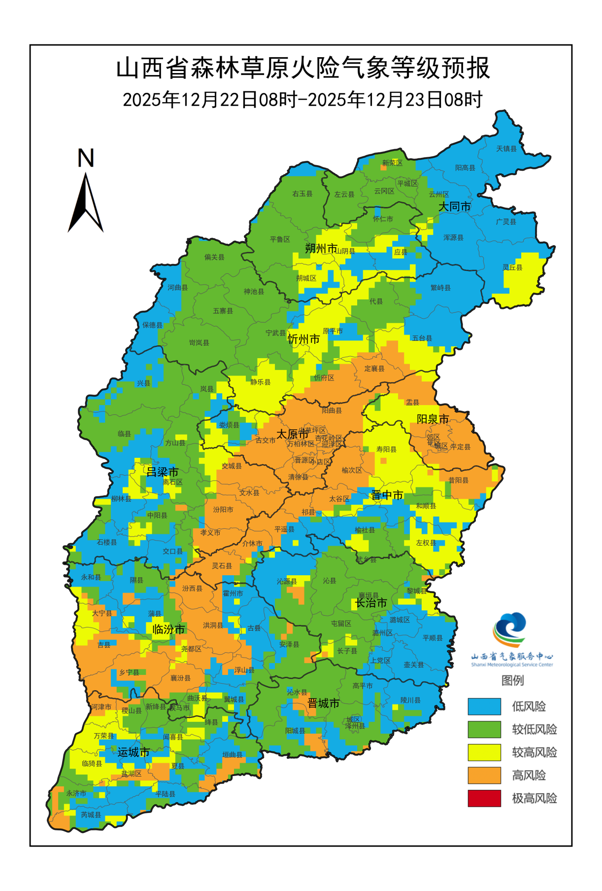 12月23日:大同(平城、云州、左云、浑源、灵丘、新荣、云冈)、朔州(右玉、平鲁、山阴、朔城、怀仁、应县)、忻州(河曲、偏关、神池、宁武、繁峙、保德、岢岚、静乐、原平、忻府、定襄、五台、代县、五寨)、阳泉(盂县、平定、郊区、阳泉城区)、太原(娄烦、尖草坪、阳曲、小店、古交、清徐、迎泽、杏花岭、万柏林、晋源)、晋中(祁县、太谷、榆次、平遥、寿阳、昔阳、左权、和顺、灵石、榆社、介休)、吕梁(临县、兴县、岚县、柳林、石楼、方山、离石、中阳、孝义、汾阳、文水、交城、交口)、临汾(永和、隰县、大宁、吉县、襄汾、蒲县、汾西、洪洞、尧都、霍州、古县、安泽、乡宁、曲沃、翼城、浮山、侯马)、长治(武乡、沁县、长子、沁源、黎城、屯留、潞城、上党、襄垣、壶关、平顺、潞州)、晋城(沁水、高平、阳城、晋城城区、陵川、泽州)、运城(稷山、万荣、河津、临猗、盐湖、新绛、绛县、闻喜、垣曲、永济、芮城、夏县、平陆)为高风险,火险气象等级高,须加强火源管理。大同(广灵)为较高风险,火险气象等级较高,须加强防范。大同(阳高、天镇)为较低风险,火险气象等级较低。