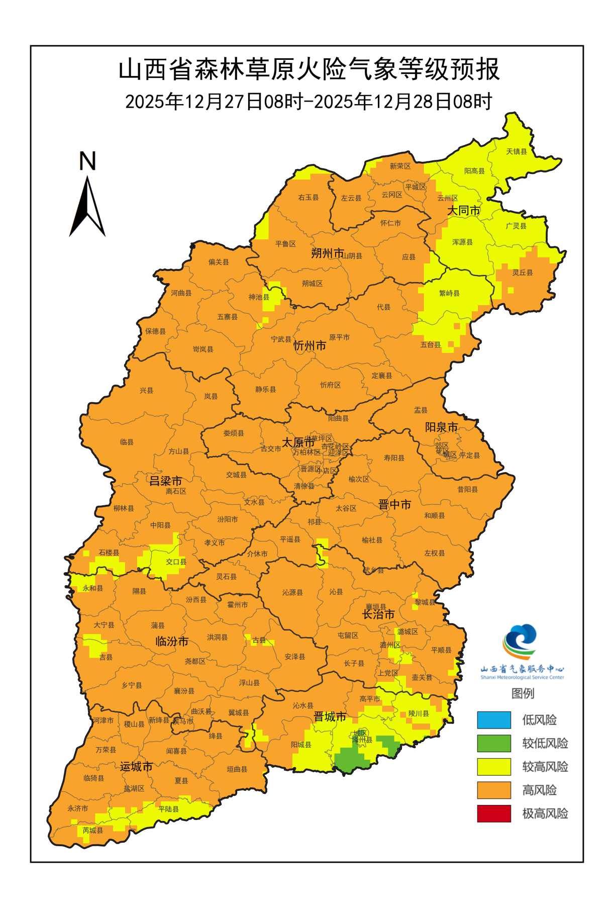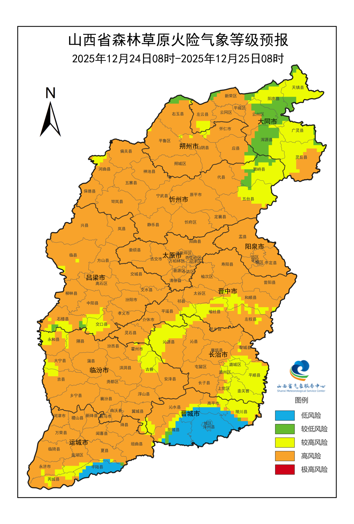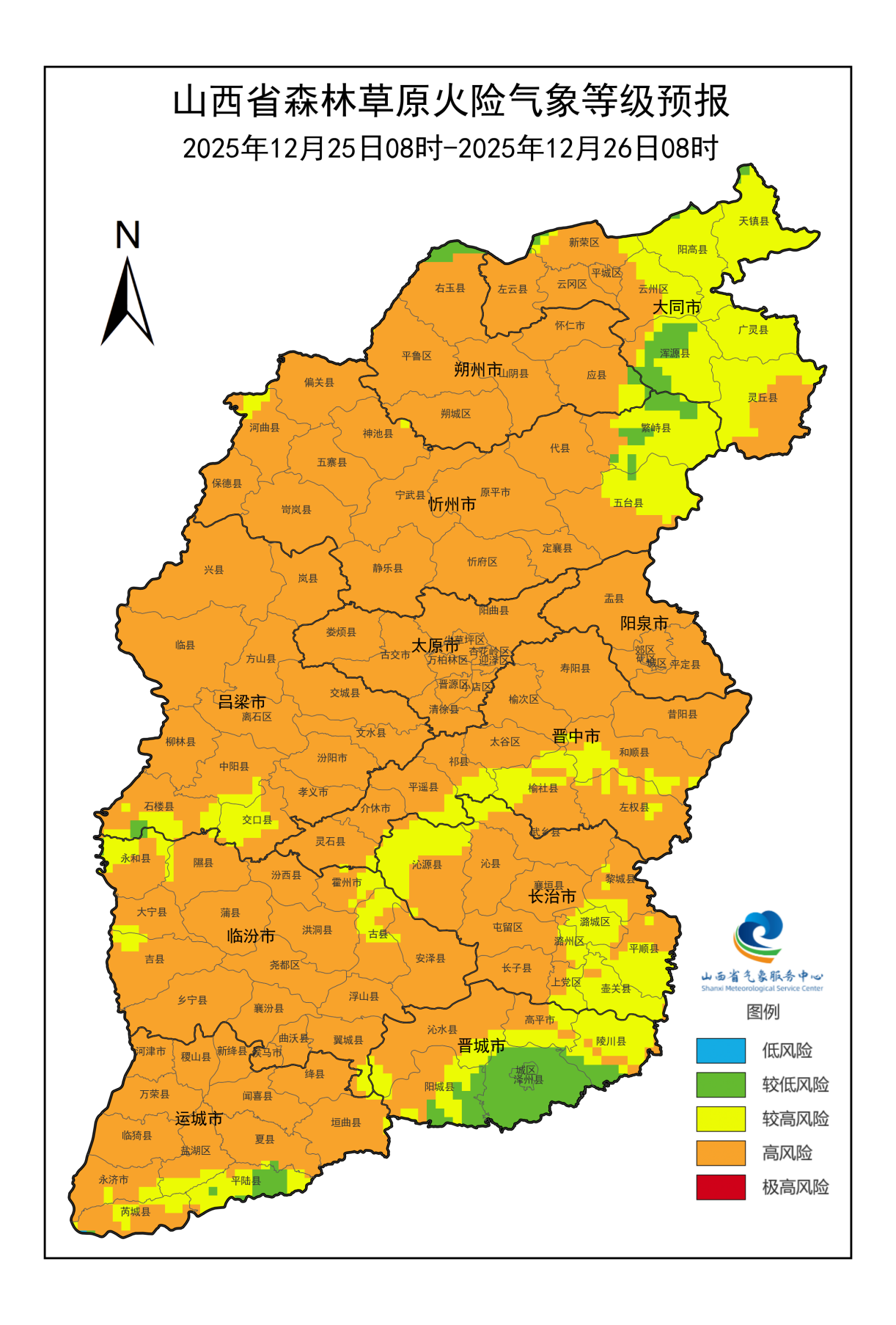 12月25日:大同(平城、云州、左云、浑源、灵丘、新荣、云冈)、朔州(右玉、平鲁、山阴、朔城、怀仁、应县)、忻州(河曲、偏关、神池、宁武、繁峙、保德、岢岚、静乐、原平、忻府、定襄、五台、代县、五寨)、阳泉(盂县、平定、郊区、阳泉城区)、太原(娄烦、尖草坪、阳曲、小店、古交、清徐、迎泽、杏花岭、万柏林、晋源)、晋中(祁县、太谷、榆次、平遥、寿阳、昔阳、左权、和顺、灵石、榆社、介休)、吕梁(临县、兴县、岚县、柳林、石楼、方山、离石、中阳、孝义、汾阳、文水、交城、交口)、临汾(永和、隰县、大宁、吉县、襄汾、蒲县、汾西、洪洞、尧都、霍州、古县、安泽、乡宁、曲沃、翼城、浮山、侯马)、长治(武乡、沁县、长子、沁源、黎城、屯留、潞城、上党、襄垣、壶关、平顺、潞州)、晋城(沁水、高平、阳城、陵川)、运城(稷山、万荣、河津、临猗、盐湖、新绛、绛县、闻喜、垣曲、永济、芮城、夏县、平陆)为高风险,火险气象等级高,须加强火源管理。大同(阳高、天镇、广灵)、晋城(泽州)为较高风险,火险气象等级较高,须加强防范。晋城(晋城城区)为较低风险,火险气象等级较低。