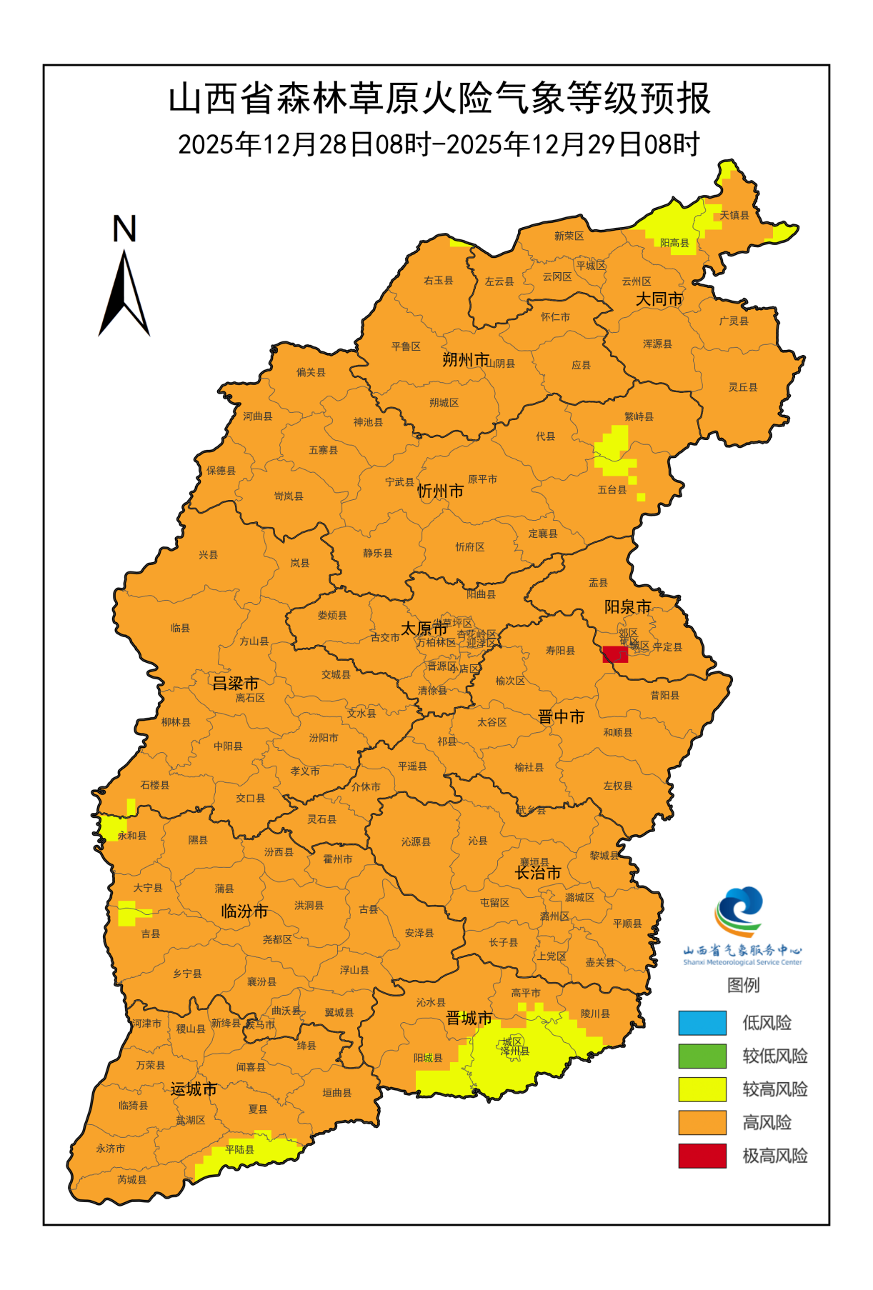 12月28日:阳泉(平定、郊区)为极高风险,火险气象等级极高,严禁一切野外用火。大同(阳高、平城、云州、天镇、左云、浑源、广灵、灵丘、新荣、云冈)、朔州(右玉、平鲁、山阴、朔城、怀仁、应县)、忻州(河曲、偏关、神池、宁武、繁峙、保德、岢岚、静乐、原平、忻府、定襄、五台、代县、五寨)、阳泉(盂县、阳泉城区)、太原(娄烦、尖草坪、阳曲、小店、古交、清徐、迎泽、杏花岭、万柏林、晋源)、晋中(祁县、太谷、榆次、平遥、寿阳、昔阳、左权、和顺、灵石、榆社、介休)、吕梁(临县、兴县、岚县、柳林、石楼、方山、离石、中阳、孝义、汾阳、文水、交城、交口)、临汾(永和、隰县、大宁、吉县、襄汾、蒲县、汾西、洪洞、尧都、霍州、古县、安泽、乡宁、曲沃、翼城、浮山、侯马)、长治(武乡、沁县、长子、沁源、黎城、屯留、潞城、上党、襄垣、壶关、平顺、潞州)、晋城(沁水、高平、阳城、陵川、泽州)、运城(稷山、万荣、河津、临猗、盐湖、新绛、绛县、闻喜、垣曲、永济、芮城、夏县、平陆)为高风险,火险气象等级高,须加强火源管理。晋城(晋城城区)为较高风险,火险气象等级较高,须加强防范。