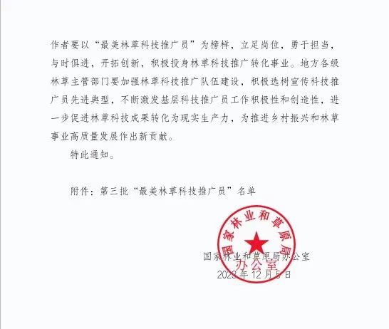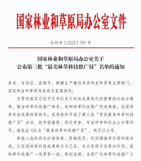 12月5日,国家林业和草原局办公室公布第三批100名全国“最美林草科技推广员”名单。山西林草系统3人荣获全国“最美林草科技推广员”称号。
